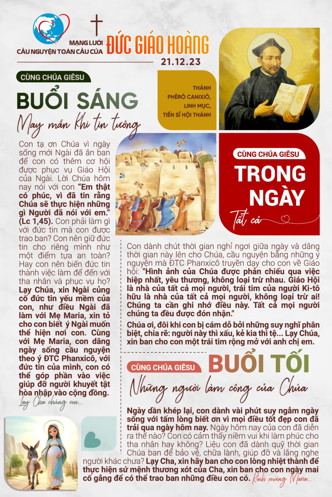 Con tạ ơn Chúa vì ngày sống mới Ngài đã ân ban để con có thêm cơ hội được phục vụ Giáo Hội của Ngài. Lời Chúa hôm nay nói với con “Em thật có phúc, vì đã tin rằng Chúa sẽ thực hiện những gì Người đã nói với em.” (Lc 1,45). Con phải làm gì với đức tin mà con được trao ban? Con nên giữ đức tin cho riêng mình như một điểm tựa an toàn? Hay con nên biến đức tin thành việc làm để đến với tha nhân và phục vụ họ? Lạy Chúa, xin Ngài củng cố đức tin yếu mềm của con, như điều Ngài đã làm với Mẹ Maria, xin tỏ cho con biết ý Ngài muốn thể hiện nơi con. Cùng với Mẹ Maria, con dâng ngày sống cầu nguyện theo ý ĐTC Phanxicô, với đức tin của mình, con có thể góp phần vào việc giúp đỡ người khuyết tật hòa nhập vào cộng đồng. Lạy Cha chúng con…