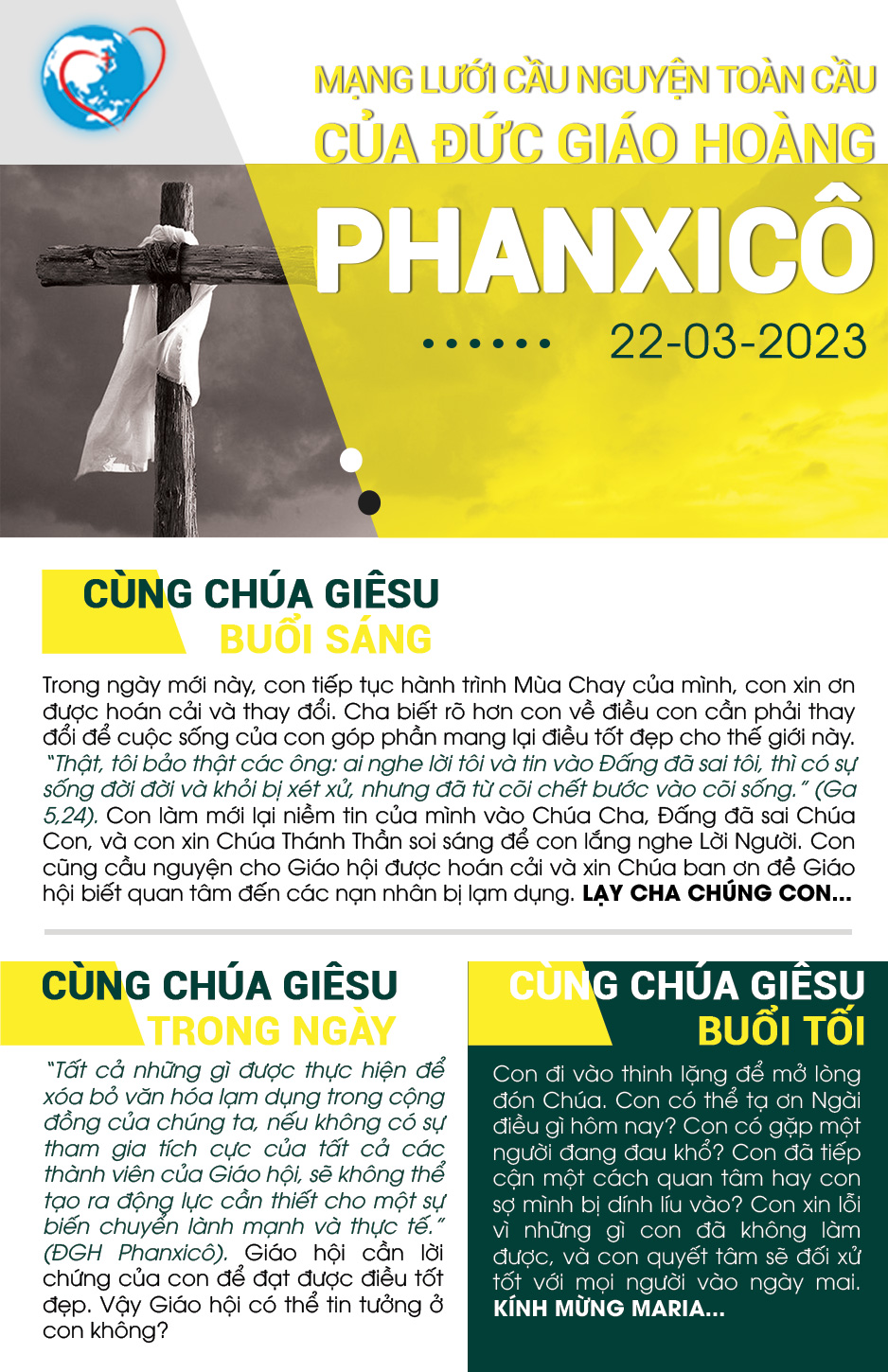 Trong ngày mới này, con tiếp tục hành trình Mùa Chay của mình, con xin ơn được hoán cải và thay đổi. Cha biết rõ hơn con về điều con cần phải thay đổi để cuộc sống của con góp phần mang lại điều tốt đẹp cho thế giới này. “Thật, tôi bảo thật các ông: ai nghe lời tôi và tin vào Đấng đã sai tôi, thì có sự sống đời đời và khỏi bị xét xử, nhưng đã từ cõi chết bước vào cõi sống.” (Ga 5,24). Con làm mới lại niềm tin của mình vào Chúa Cha, Đấng đã sai Chúa Con, và con xin Chúa Thánh Thần soi sáng để con lắng nghe Lời Người. Con cũng cầu nguyện cho Giáo hội được hoán cải và xin Chúa ban ơn để Giáo hội biết quan tâm đến các nạn nhân bị lạm dụng. Lạy Cha chúng con…