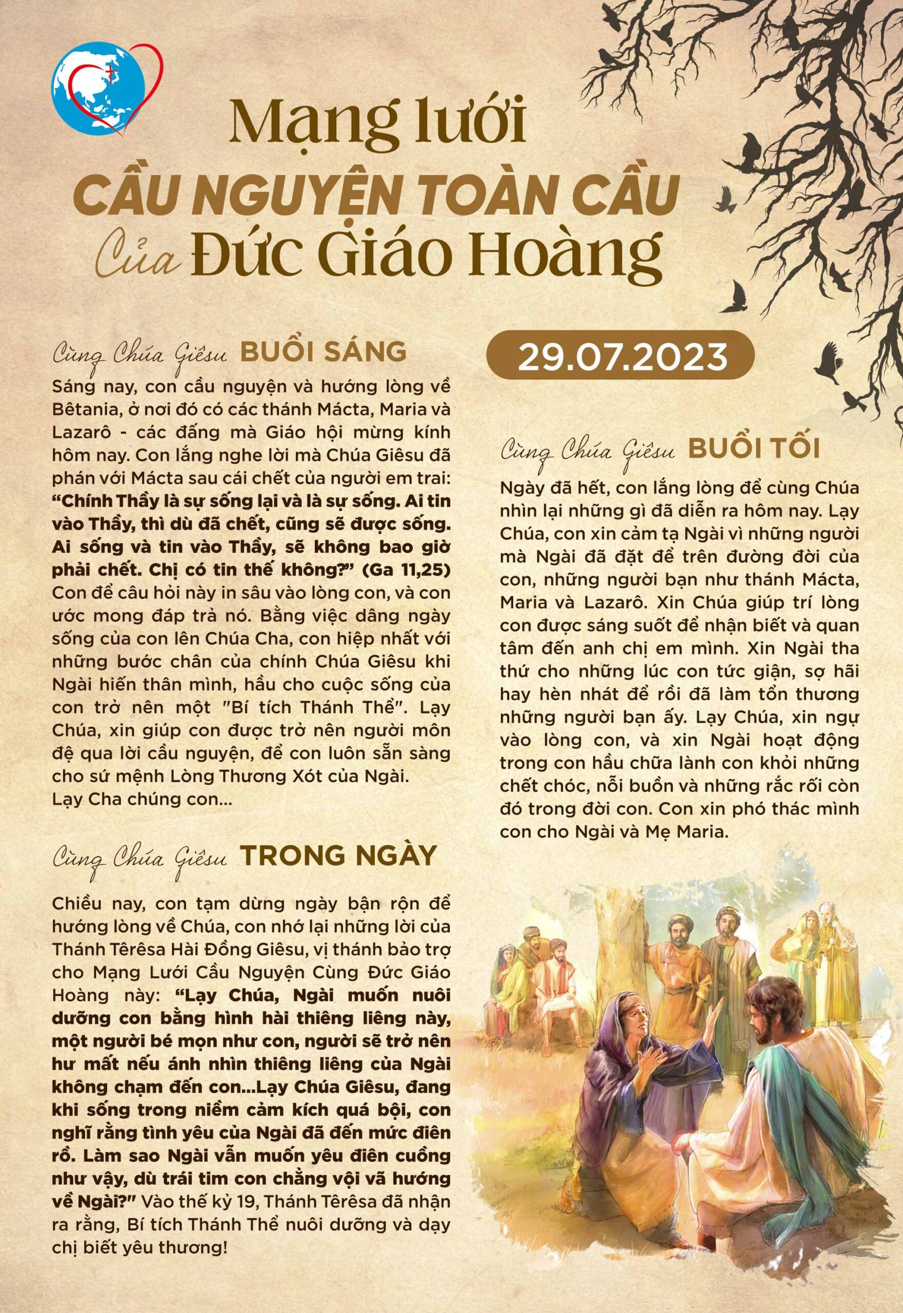 Sáng nay, con cầu nguyện và hướng lòng về Bêtania, ở nơi đó có các thánh Mácta, Maria và Lazarô – các đấng mà Giáo hội mừng kính hôm nay. Con lắng nghe lời mà Chúa Giêsu đã phán với Mácta sau cái chết của người em trai: “Chính Thầy là sự sống lại và là sự sống. Ai tin vào Thầy, thì dù đã chết, cũng sẽ được sống. Ai sống và tin vào Thầy, sẽ không bao giờ phải chết. Chị có tin thế không?” (Ga 11,25) Con để câu hỏi này in sâu vào lòng con, và con ước mong đáp trả nó. Bằng việc dâng ngày sống của con lên Chúa Cha, con hiệp nhất với những bước chân của chính Chúa Giêsu khi Ngài hiến thân mình, hầu cho cuộc sống của con trở nên một “Bí tích Thánh Thể”. Lạy Chúa, xin giúp con được trở nên người môn đệ qua lời cầu nguyện, để con luôn sẵn sàng cho sứ mệnh Lòng Thương Xót của Ngài. Lạy Cha chúng con…