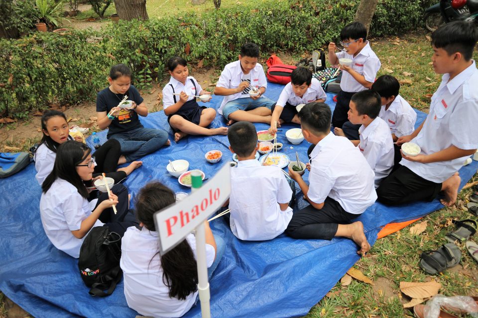 Mồ hôi đã bắt đầu ròng chảy trên gò má, chắc hẳn những mâm cơm quay quần ngồi ăn bên nhau theo nhóm là phần các em mong chờ nhất. Đó là những chén cơm đượm thắm công lao của các cô bác góp công góp sức chuẩn bị, chăm lo cho thế hệ tương lai của Giáo xứ.