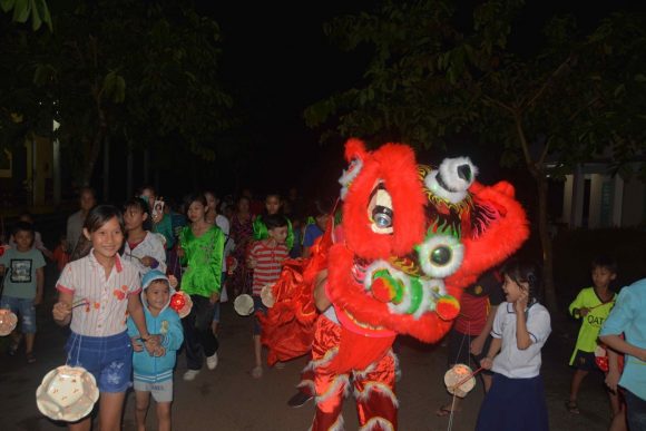 7h tối, chúng tôi cùng các em nhỏ rước đèn từ nhà thờ sang hội trường. Câu hát trẻ thơ được cất lên dưới ánh trăng tròn hoàn hảo ngày nào “tùng dinh dinh cắt tùng dinh dinh, em rước đèn dưới ánh trăng rằm, đèn ông sao với đèn cá chép, đèn thiên nga với đèn bướm bướm…” Tiếng hát trong trẻo ấy cùng mang theo bao kỷ niệm tuổi thơ dưới quê nhà, rước đèn cùng lũ bạn. Lũ trẻ làm tôi nhận ra bản thân đã bước đến cái tuổi trưởng thành, đủ thứ chuyện cần lo, nhưng đôi khi nhìn lại cũng cần phải có giây phút cười thật tươi, xõa hết bao nếp sống cũ kỹ để quay ngược lại với thời gian. Cơn mưa rào lất phất cùng cơn gió lành lạnh của đêm trăng mùa thu. Nói chính xác thì đêm hôm nay là một đêm may mắn, nhờ lời cầu nguyện của 500 anh em gần xa mà Chúa đã thương tình không đổ cơn mưa xối xả như đêm hôm trước.